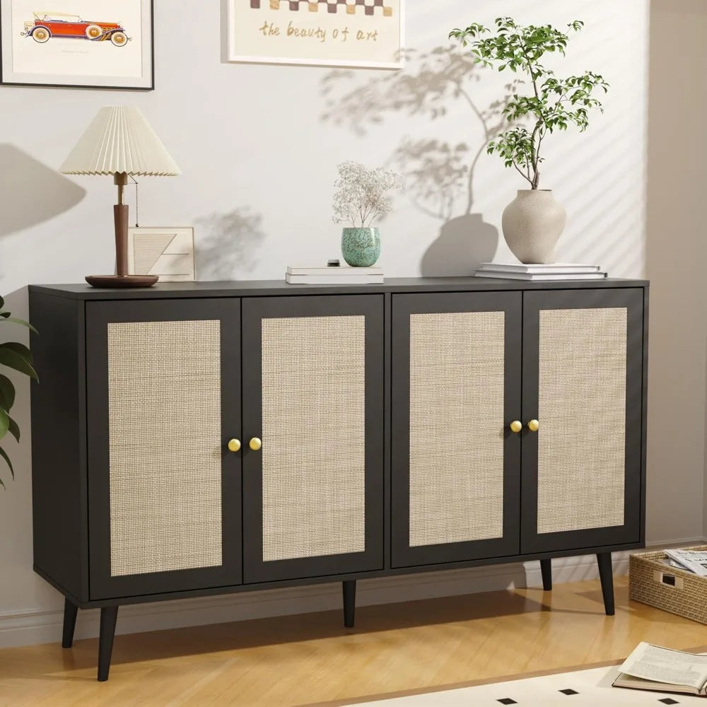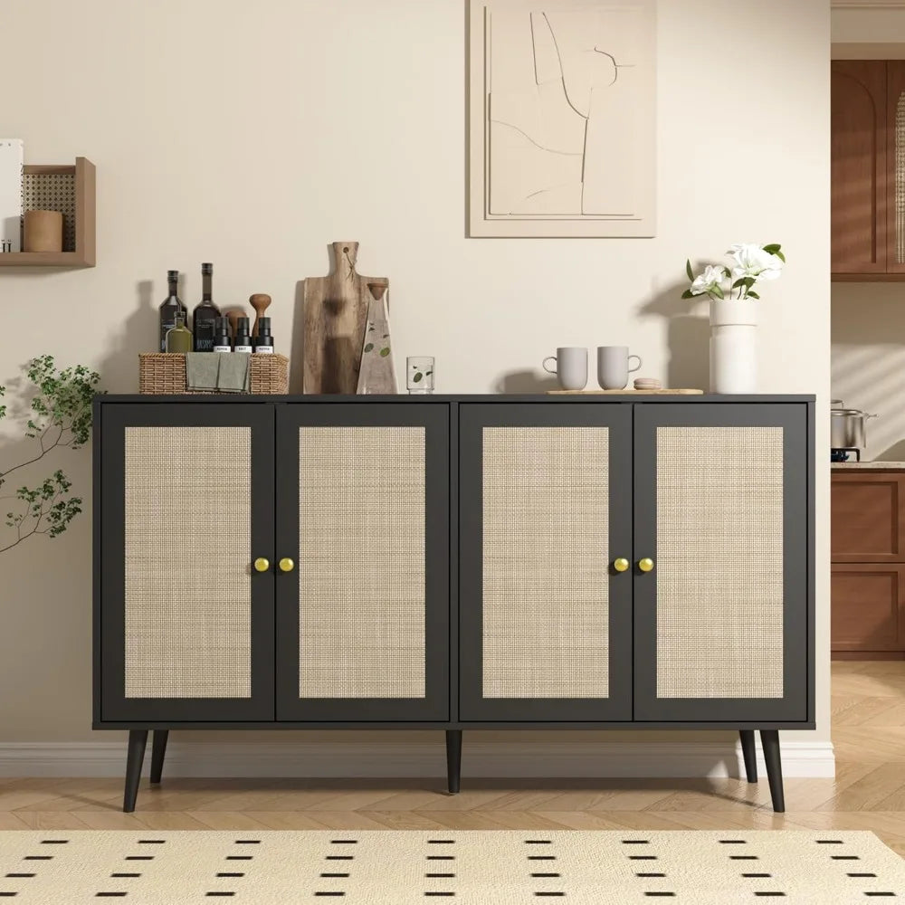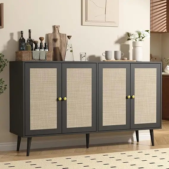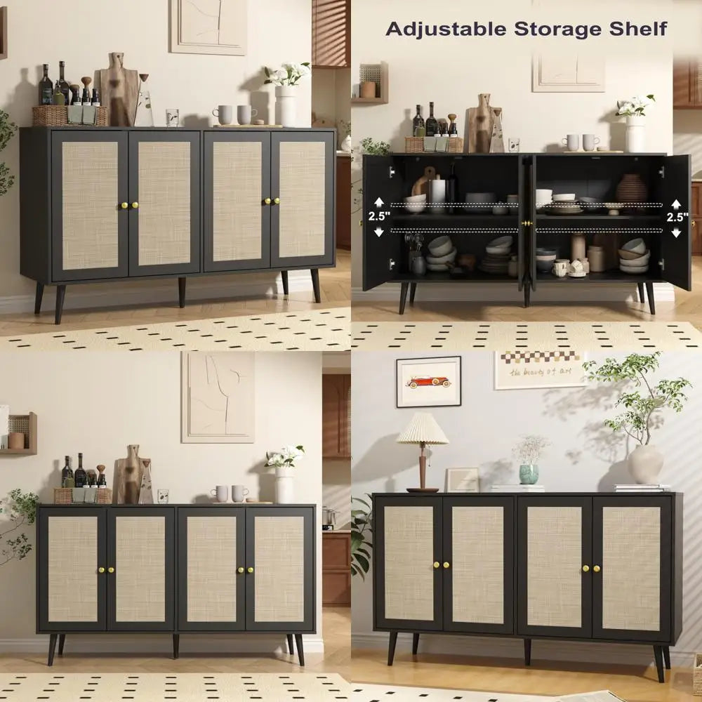 When your home needs storage that works across multiple rooms and purposes, this expansive four-door cabinet becomes your secret weapon. Designed for modern homeowners who appreciate the warmth of natural materials and the versatility of thoughtful design, this piece seamlessly transitions from coffee bar to media console to dining sideboard. The woven rattan doors bring organic texture and bohemian sophistication, while adjustable shelving inside adapts to whatever you need to store—from dinner plates to vinyl records to everyday clutter. At 55 inches wide, it offers serious storage capacity without overwhelming your space, proving that practical furniture can absolutely be beautiful.
