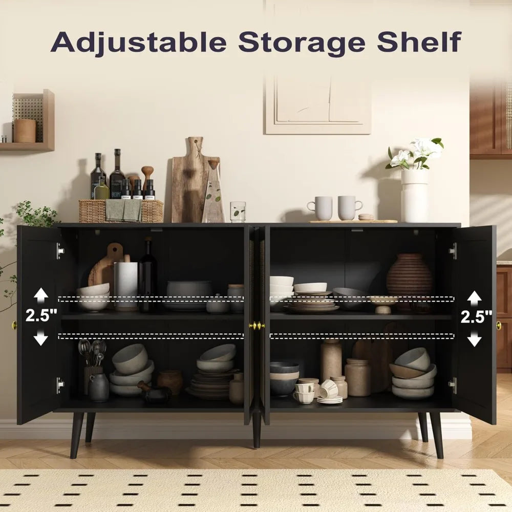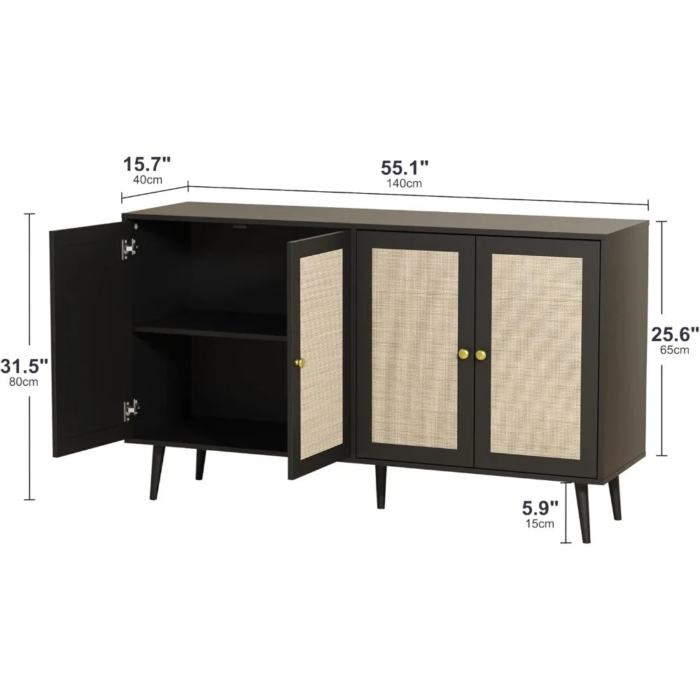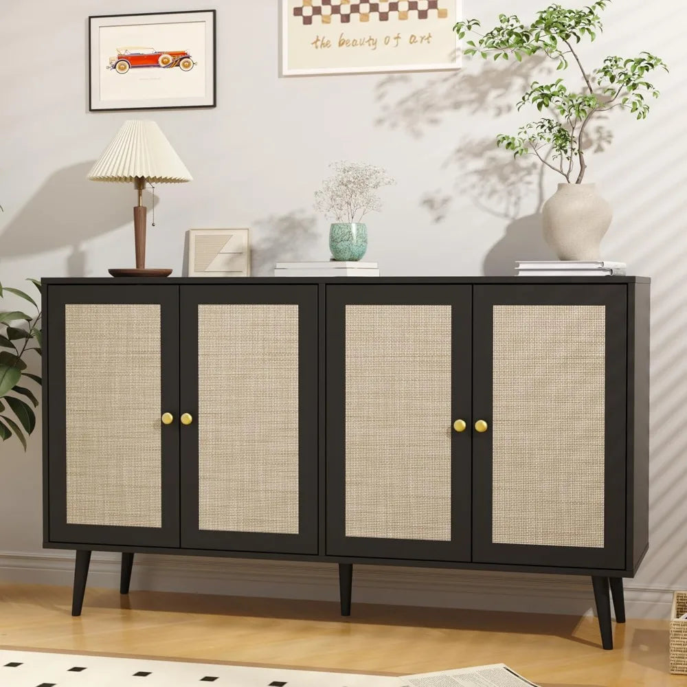 When your home needs storage that works across multiple rooms and purposes, this expansive four-door cabinet becomes your secret weapon. Designed for modern homeowners who appreciate the warmth of natural materials and the versatility of thoughtful design, this piece seamlessly transitions from coffee bar to media console to dining sideboard. The woven rattan doors bring organic texture and bohemian sophistication, while adjustable shelving inside adapts to whatever you need to store—from dinner plates to vinyl records to everyday clutter. At 55 inches wide, it offers serious storage capacity without overwhelming your space, proving that practical furniture can absolutely be beautiful.