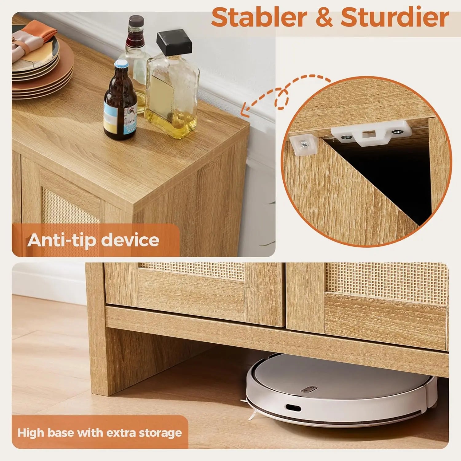 Create an organized, stylish kitchen or living space with this generously sized buffet cabinet featuring natural rattan doors and ample storage for appliances and essentials. This versatile piece addresses the need for substantial storage that accommodates modern kitchen appliances while maintaining a warm, farmhouse aesthetic. Perfect for homeowners setting up dedicated coffee bar stations, busy families needing organized appliance storage, and design enthusiasts who appreciate bohemian touches in functional furniture. Experience the freedom of adjustable shelving that holds everything from coffee makers to air fryers while natural wood tones and rattan detailing bring organic warmth to your space.