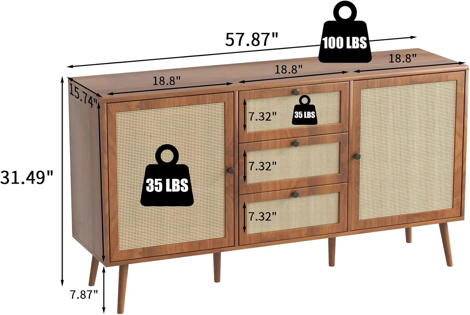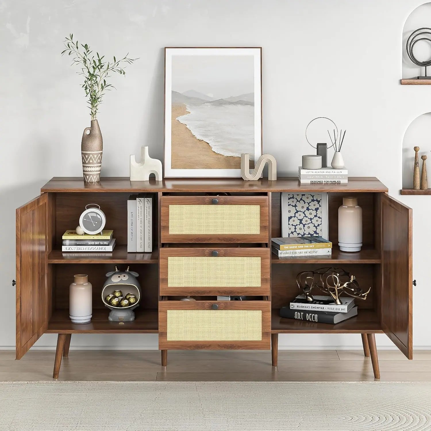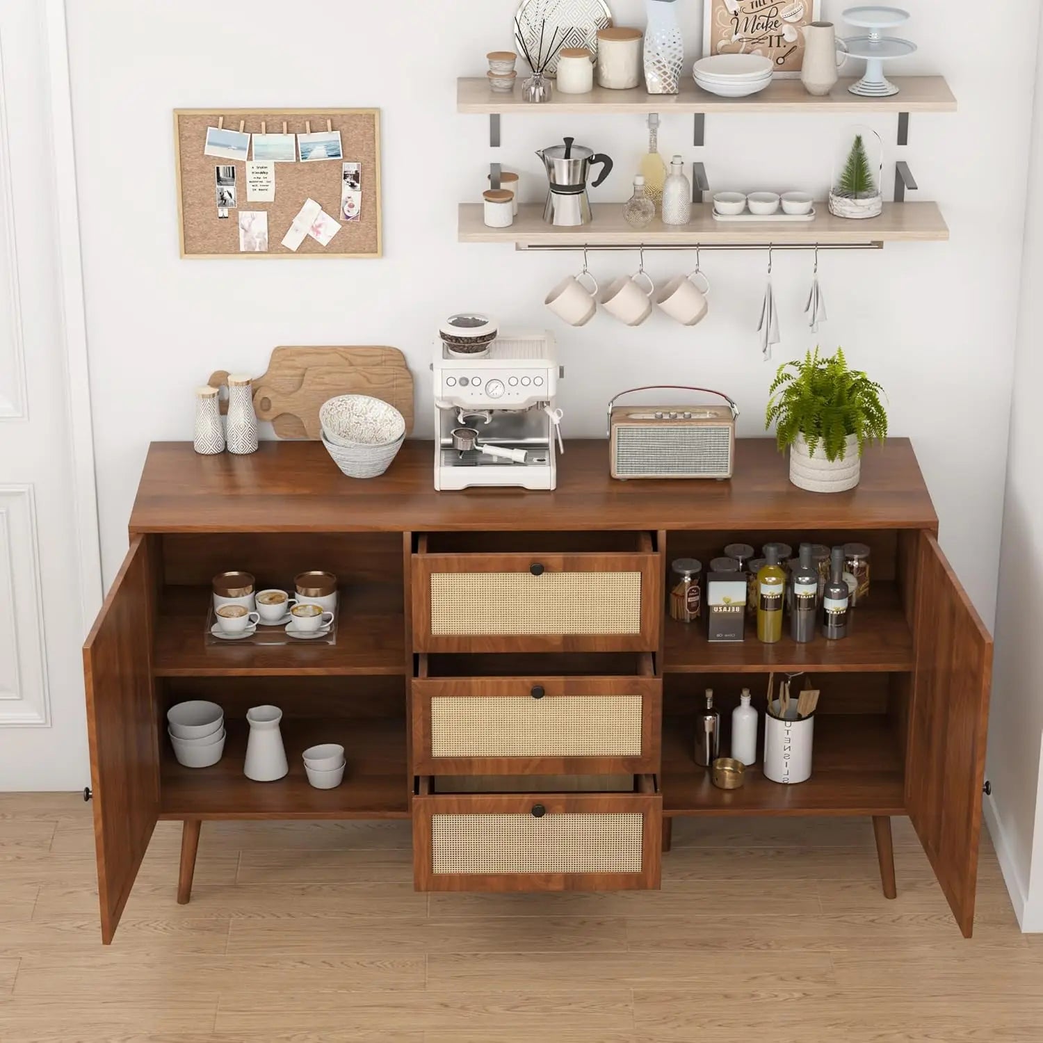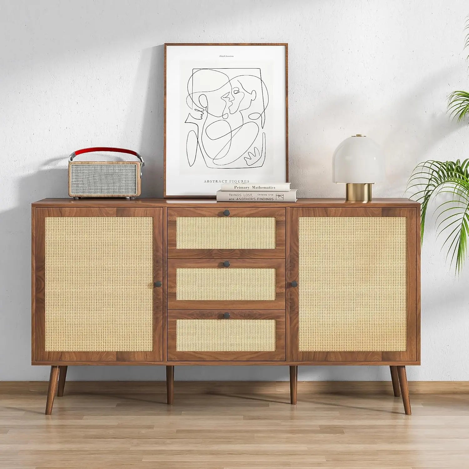 When your home needs serious storage but you refuse to settle for purely utilitarian furniture, this three-drawer buffet becomes your perfect ally. Designed for homeowners juggling the demands of real life—kitchen essentials, dining linens, living room clutter—this piece offers an impressive combination of drawers and cabinets that keep everything organized and out of sight. The walnut finish and natural rattan doors bring farmhouse warmth with a bohemian twist, while six solid wood legs ensure this hardworking piece stays stable under the weight of daily life. It's the kind of furniture that earns its keep every single day while making your space feel thoughtfully designed.