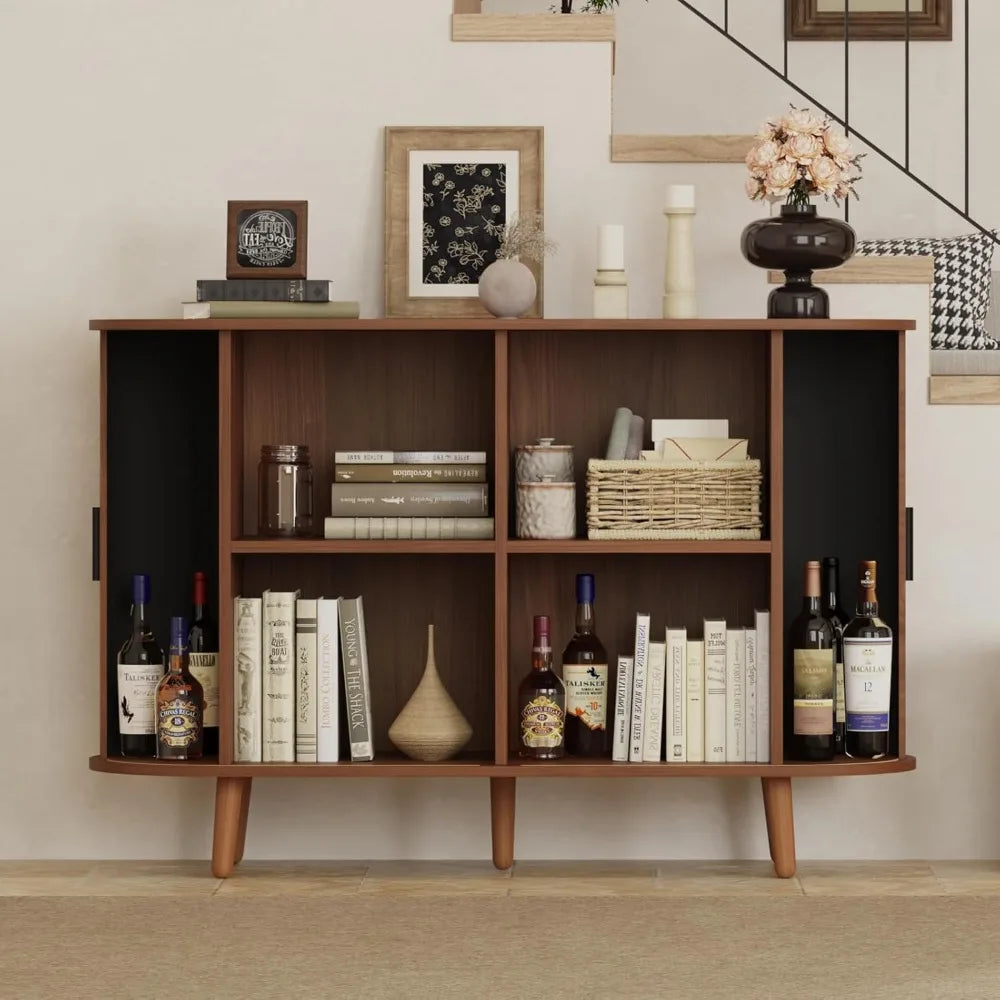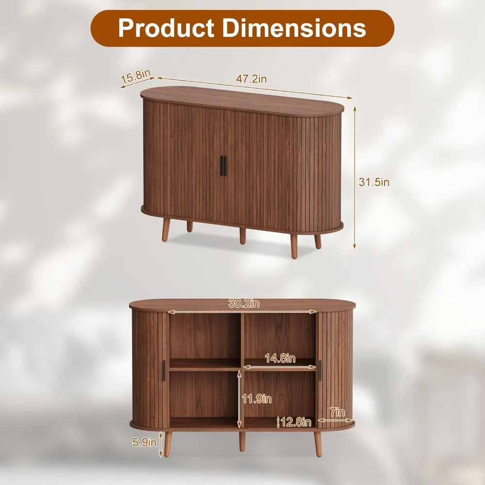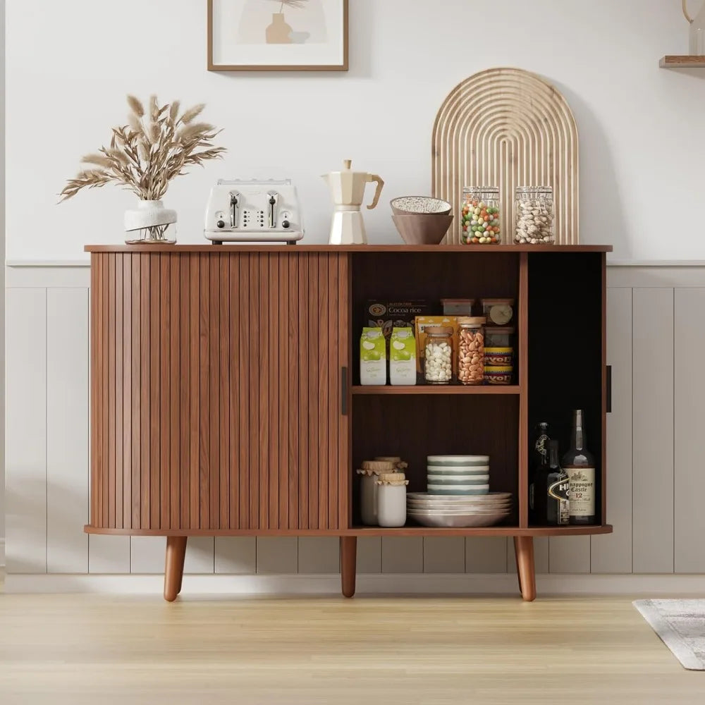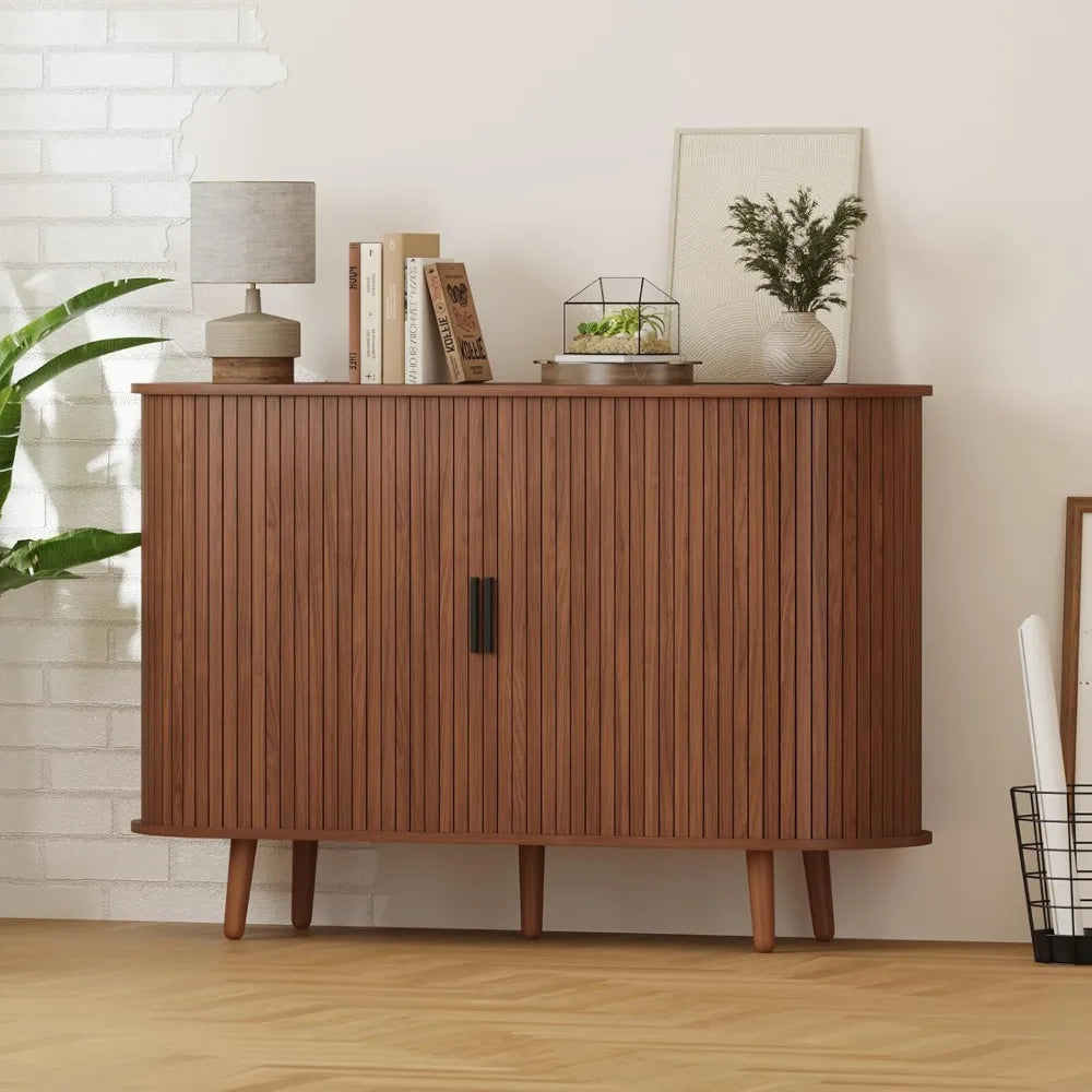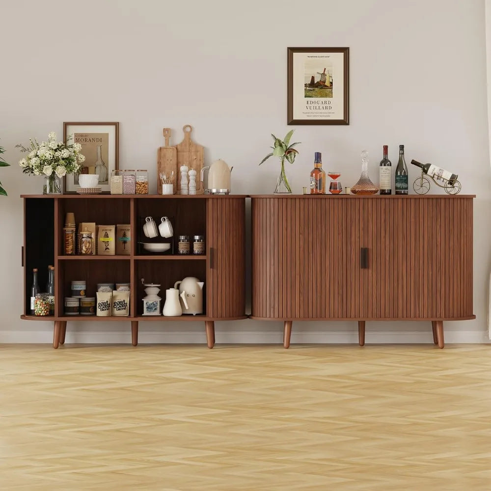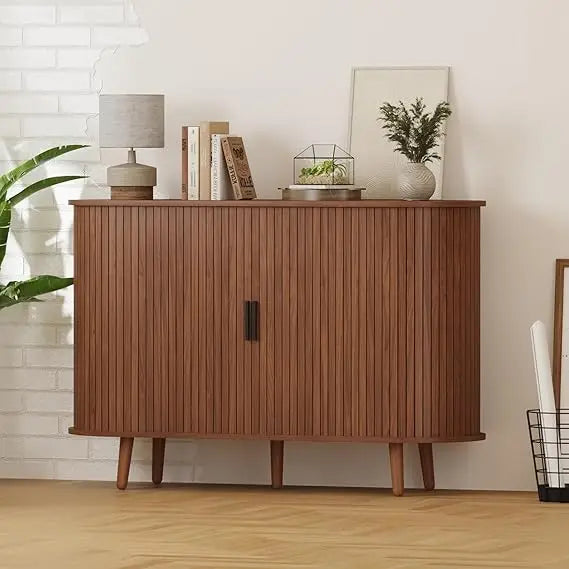 Redefine your living space with this artfully designed buffet cabinet where flowing curved edges meet elegant fluted sliding doors for effortless mid-century sophistication. This innovative piece addresses the challenge of maximizing storage compartments while maintaining smooth, uninterrupted lines that sliding doors provide. Perfect for homeowners appreciating space-saving sliding mechanisms, collectors organizing diverse items across multiple compartments, and mid-century purists who value furniture that honors classic design principles with contemporary refinement. Experience the satisfaction of six dedicated storage sections that keep everything from dinnerware to media equipment organized while smooth-sliding doors operate effortlessly to reveal or conceal your belongings with graceful ease.
