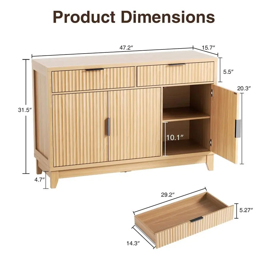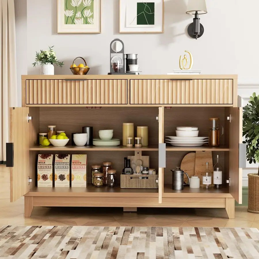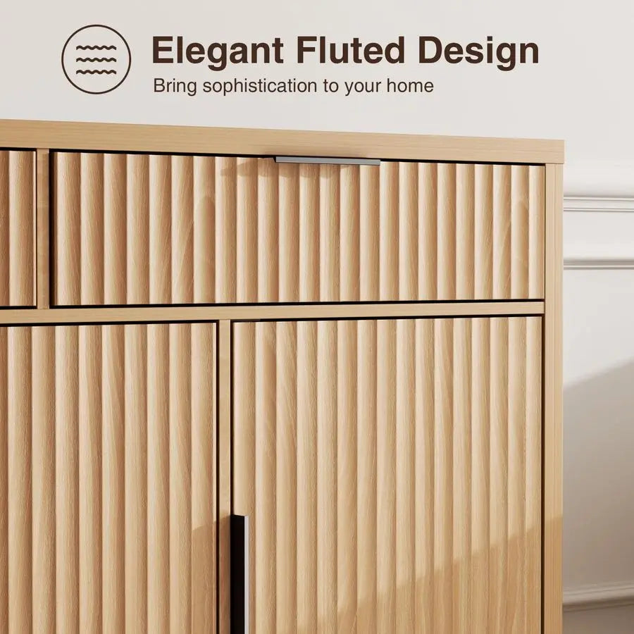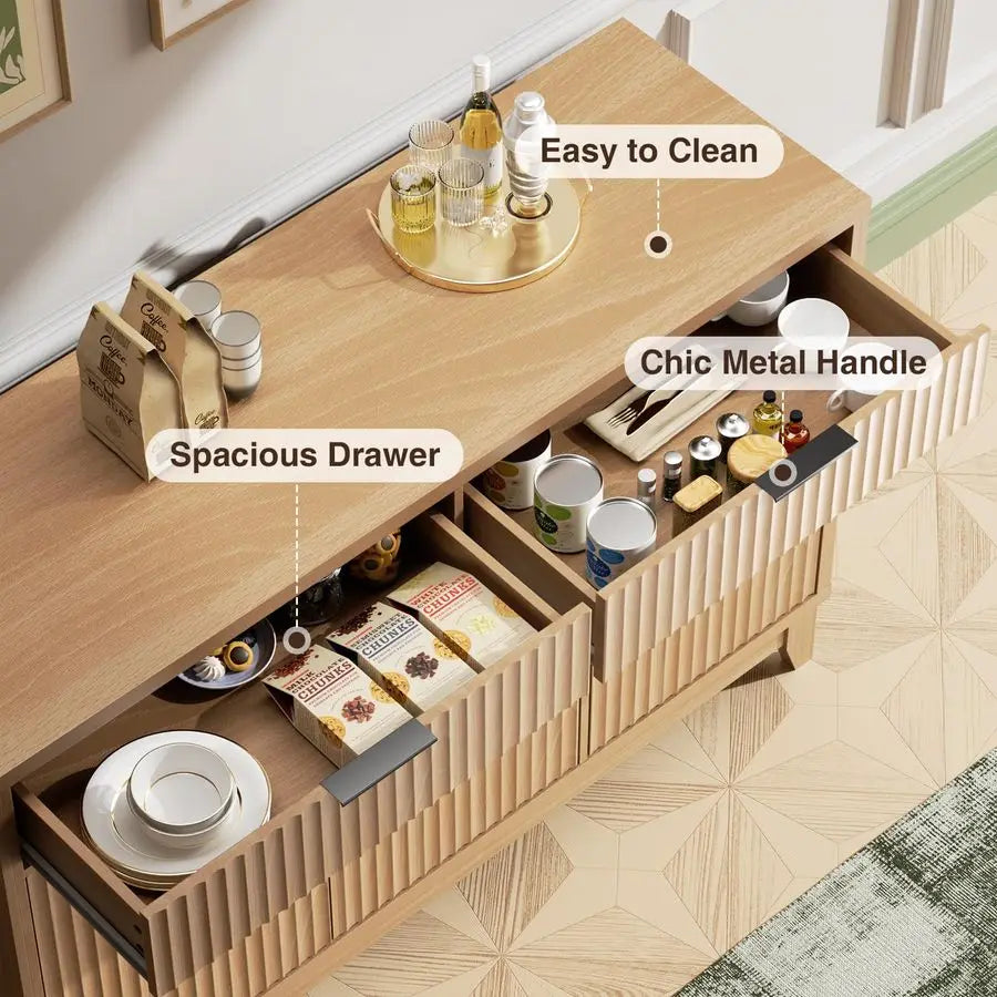 Enhance your storage capabilities with this elegant buffet cabinet featuring distinctive wave-inspired fluted panels that add dimensional depth and textural sophistication. This versatile piece addresses the need for both open drawer access and concealed cabinet storage while maintaining the refined minimalist aesthetic modern homes demand. Perfect for organized homeowners who appreciate designated drawer space, multi-room furniture users seeking adaptable pieces, and design enthusiasts who value the interplay of smooth surfaces with grooved textures. Experience the practicality of waterproof countertops that simplify maintenance paired with premium MDF construction and sturdy wooden legs that ensure this cabinet serves you beautifully for years to come.