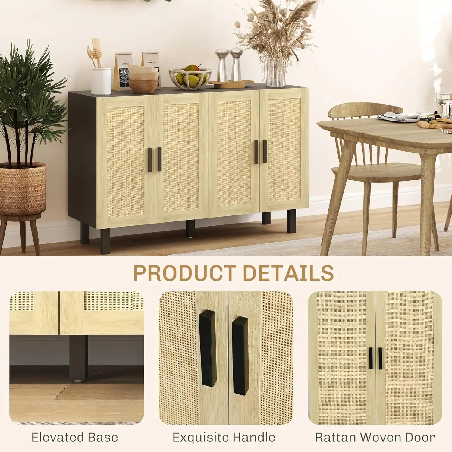 Infuse your space with organic charm through this stunning buffet cabinet featuring handwoven rattan wicker doors that bring texture and warmth to any room. This versatile piece addresses the need for substantial concealed storage while embracing the popular bohemian design trend. Perfect for homeowners creating coastal-inspired spaces, design enthusiasts curating eclectic interiors, and practical decorators who need multi-room furniture solutions. Experience the freedom of adjustable storage that keeps belongings dust-free and organized while elevated legs ensure easy floor cleaning and protection from spills.