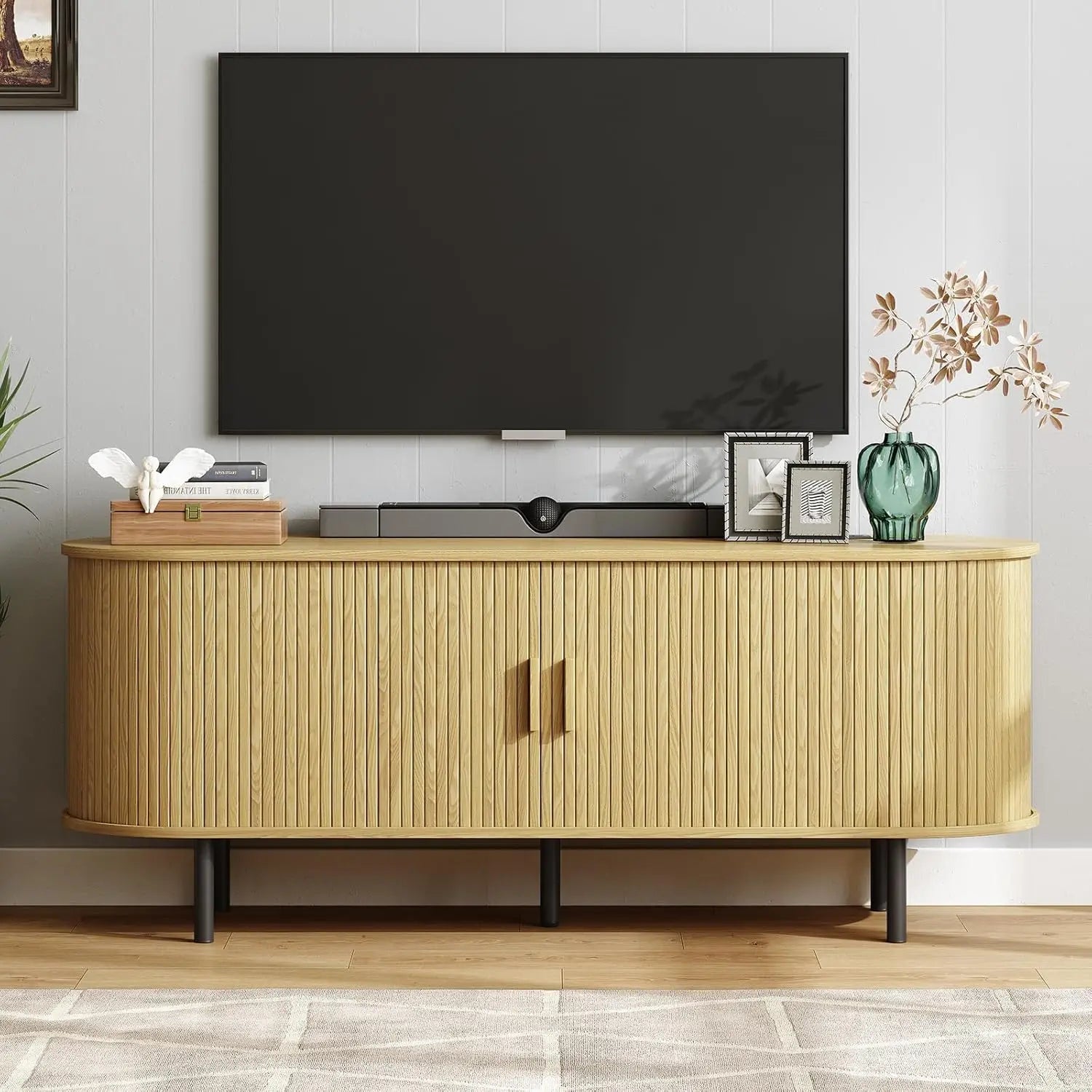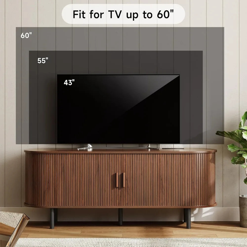 This 55" TV Stand brings both elegance and practicality to your living room. Featuring a unique sliding door design with walnut finish, this entertainment center includes ample storage space, adjustable shelves, and built-in power outlets for all your electronic devices. Perfect for modern spaces, this TV stand keeps your home organized while offering a sleek, stylish look.
