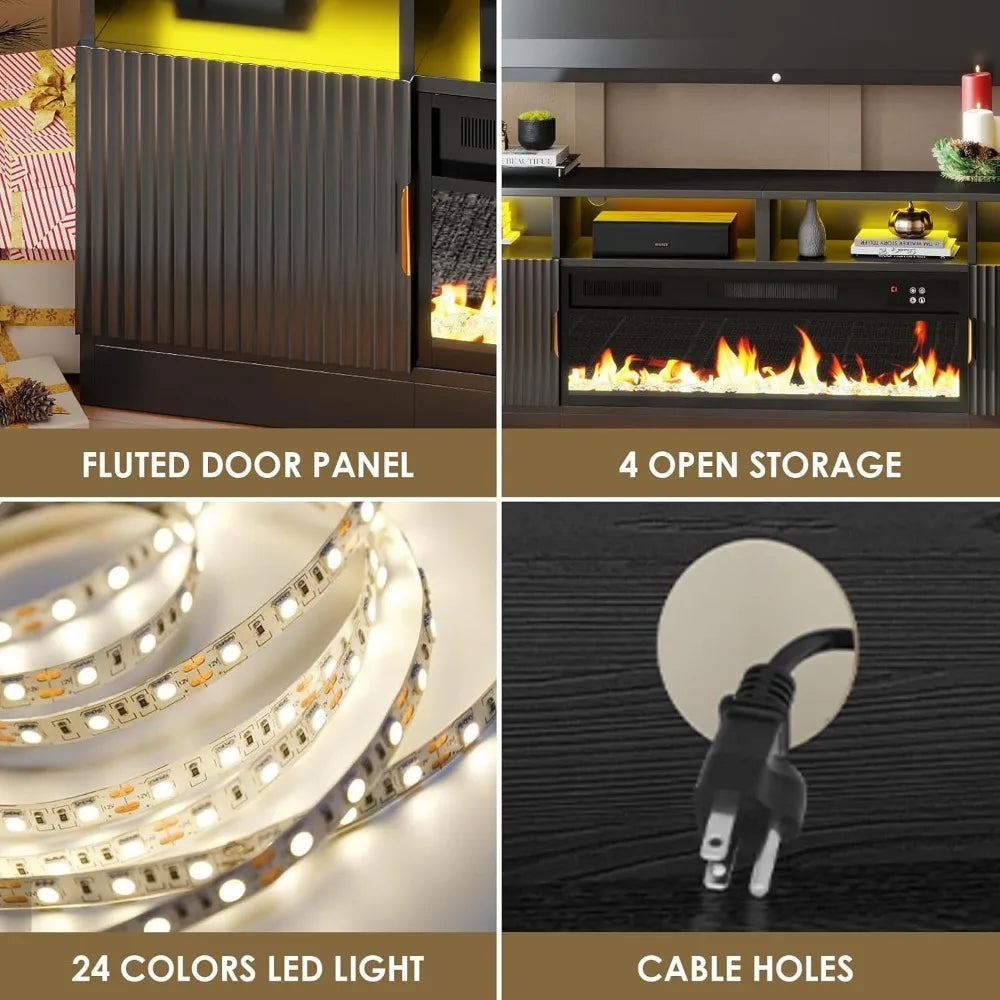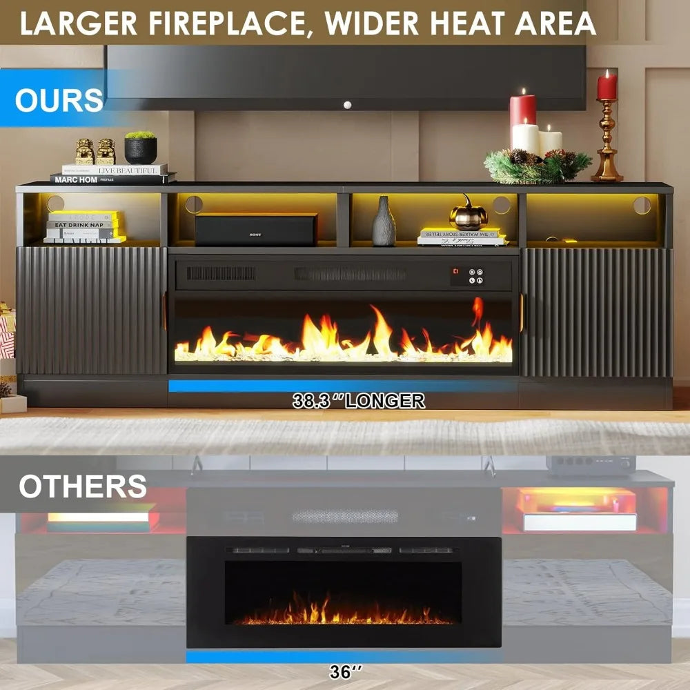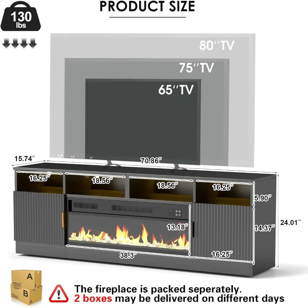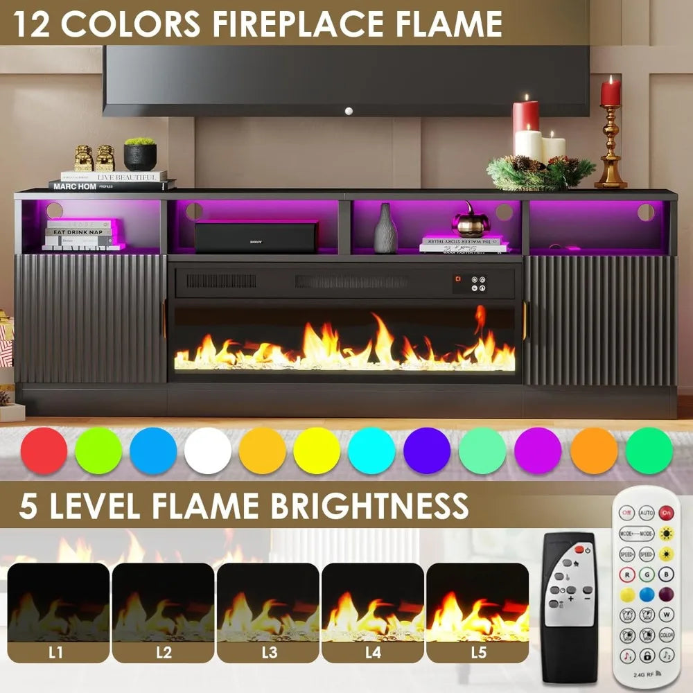 This 70" Fireplace TV Stand features a powerful 38.3" electric fireplace with 24 color LED lights to enhance the atmosphere of any room. Offering adjustable flame settings, heating control, and a cozy ambiance, it’s perfect for enjoying TV shows or family gatherings. The sleek black design, fluted storage cabinets, and ample space for TVs up to 80" make it a stunning centerpiece for your living room.