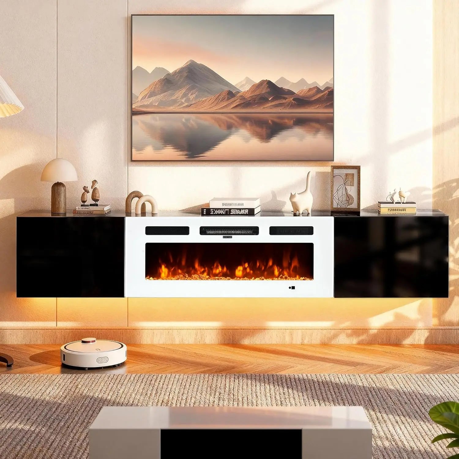 This sleek, floating TV stand with a 36" electric fireplace offers the perfect blend of modern style and functionality. Designed to complement TVs up to 80", it features adjustable partitions, maximizing storage while providing a clutter-free, easy-to-clean solution for your living space. The contemporary design of the high gloss cabinet and mirrored fireplace insert brings both elegance and warmth to any room.