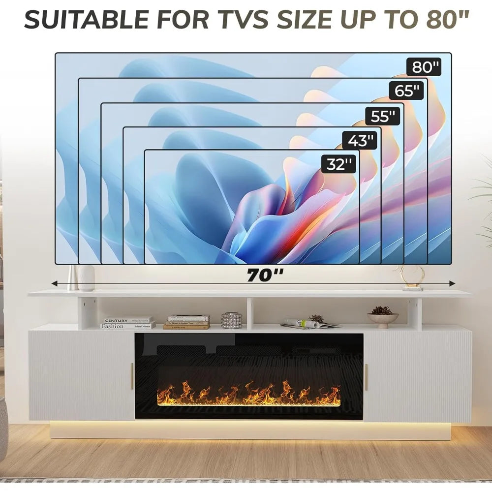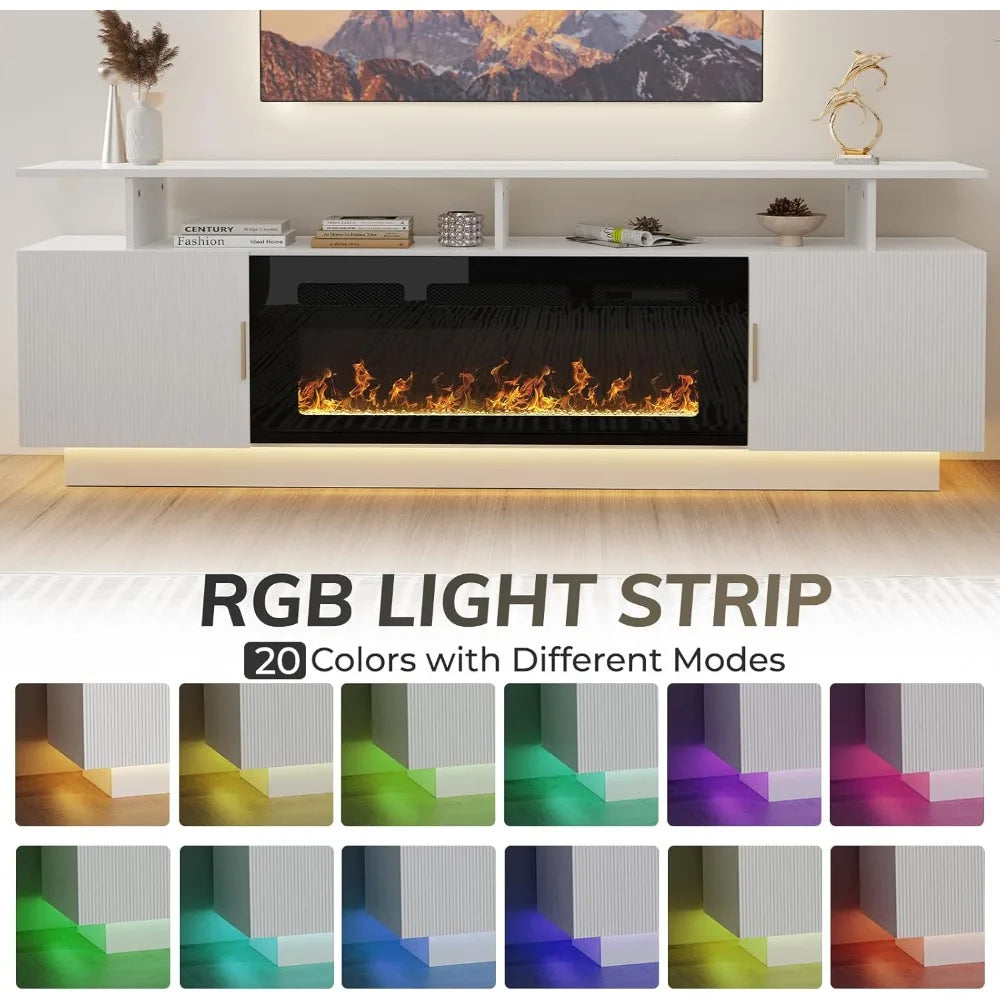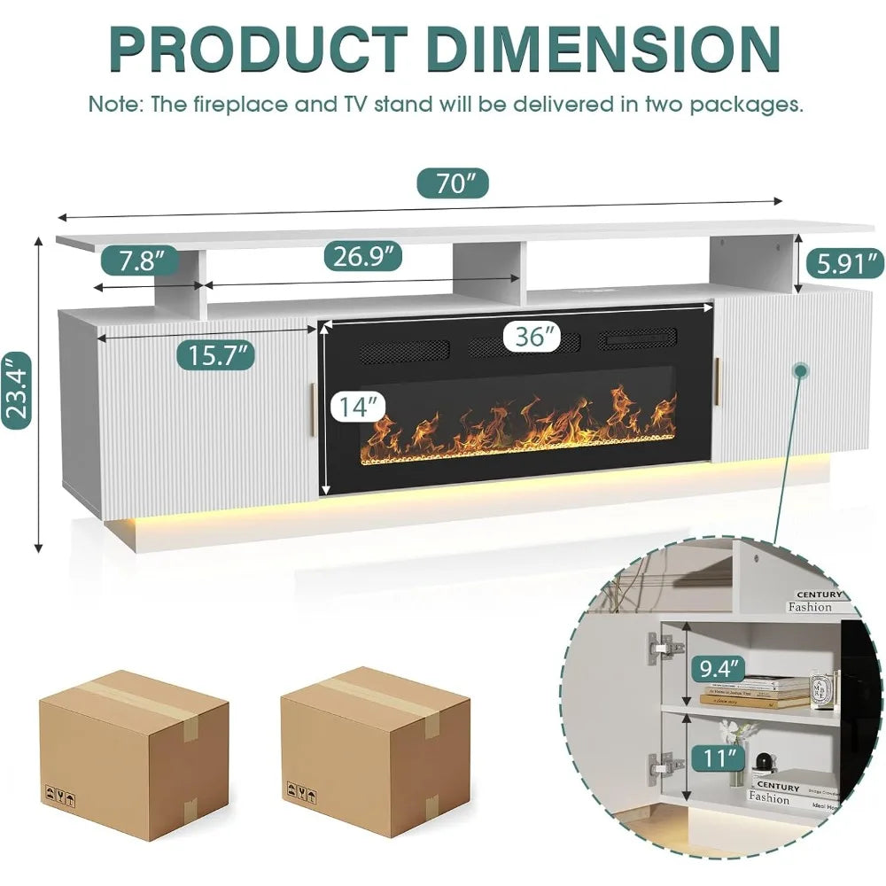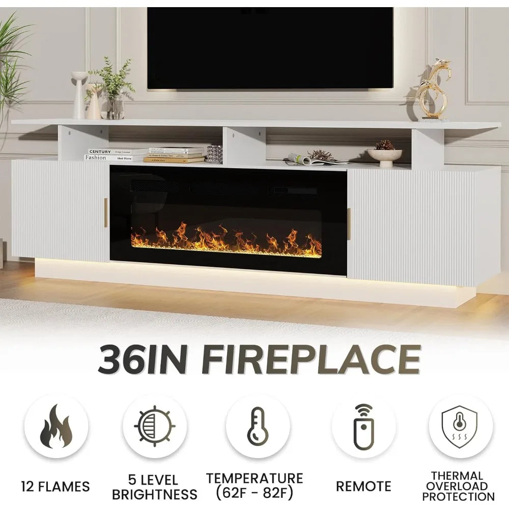 The HUANZHUANG Modern Morocco TV Stand with a built-in 36" electric fireplace combines contemporary elegance with cozy warmth. This 80" fluted cabinet accommodates TVs up to 75" and features ample storage with 3 open shelves and 2 large cabinets. With adjustable LED lighting and customizable flame colors, this stylish stand enhances your living room or bedroom while keeping everything neat and organized. The built-in power outlets and cable management ensure a clutter-free experience, while the electric fireplace adds both visual appeal and warmth to your space.