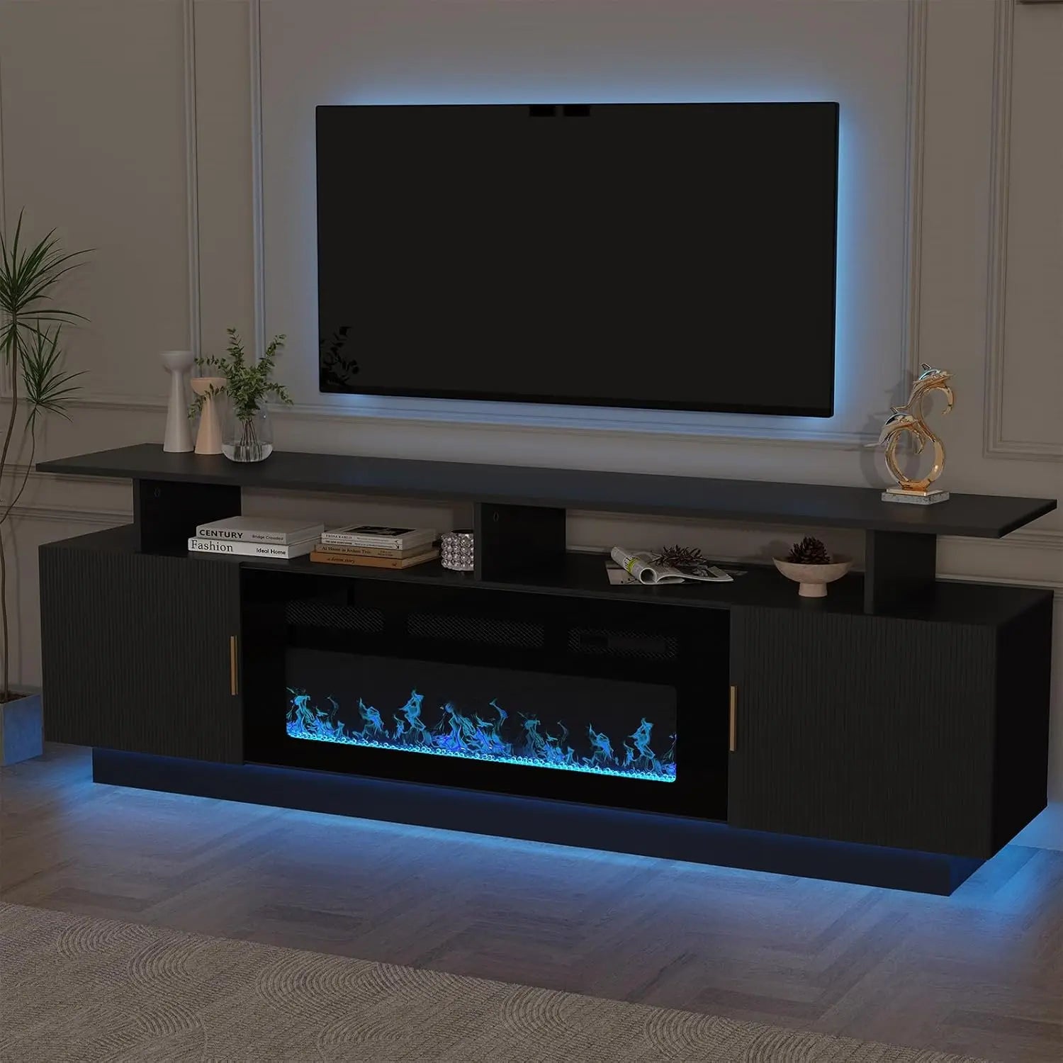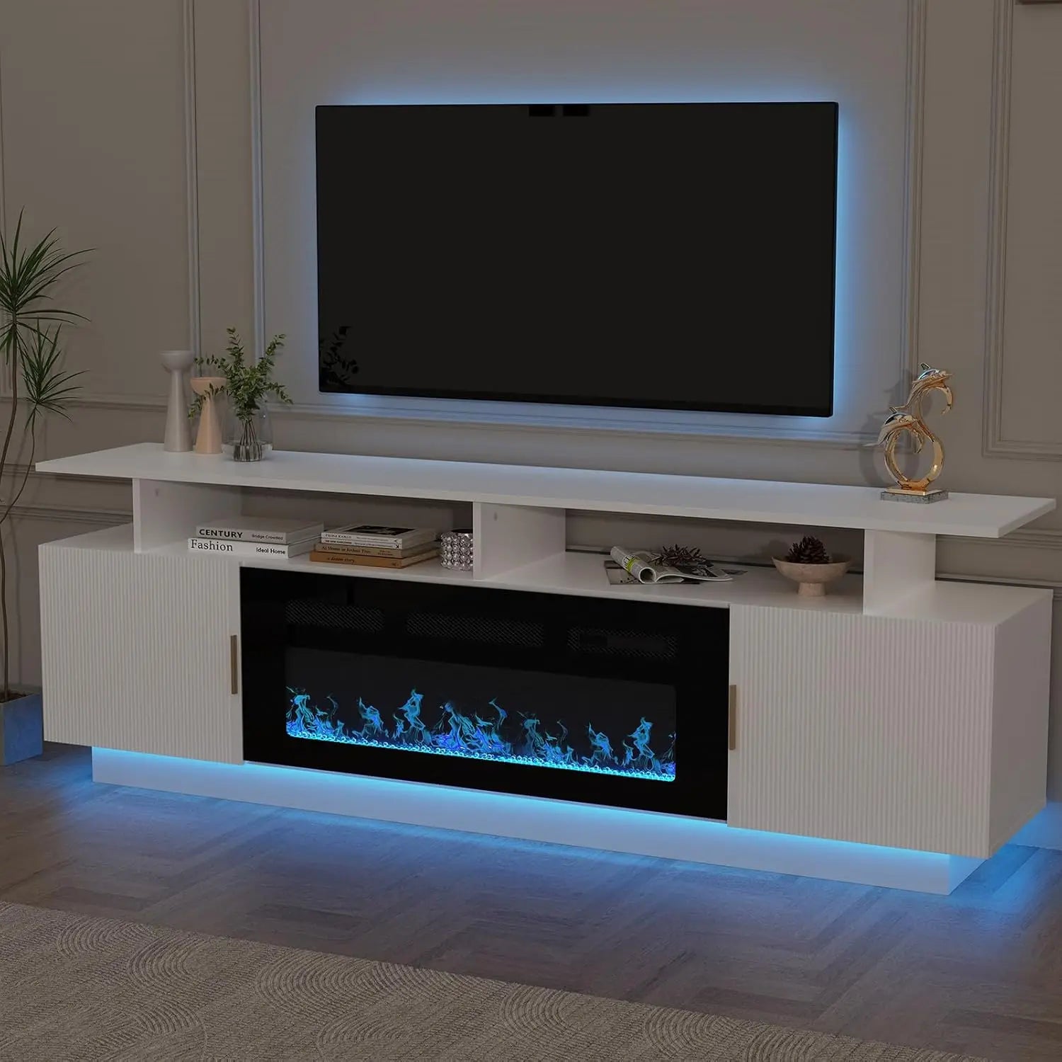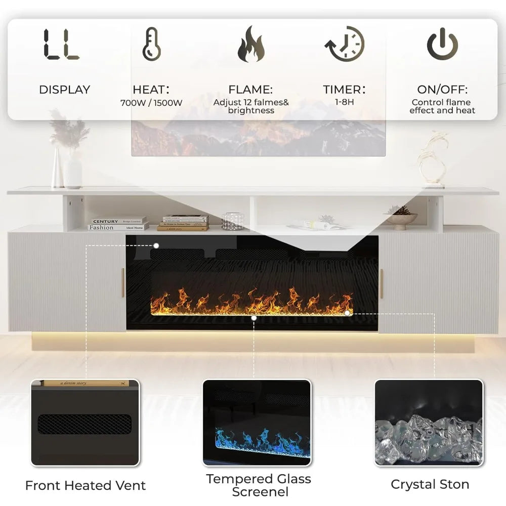 The HUANZHUANG Modern Morocco TV Stand with a built-in 36" electric fireplace combines contemporary elegance with cozy warmth. This 80" fluted cabinet accommodates TVs up to 75" and features ample storage with 3 open shelves and 2 large cabinets. With adjustable LED lighting and customizable flame colors, this stylish stand enhances your living room or bedroom while keeping everything neat and organized. The built-in power outlets and cable management ensure a clutter-free experience, while the electric fireplace adds both visual appeal and warmth to your space.