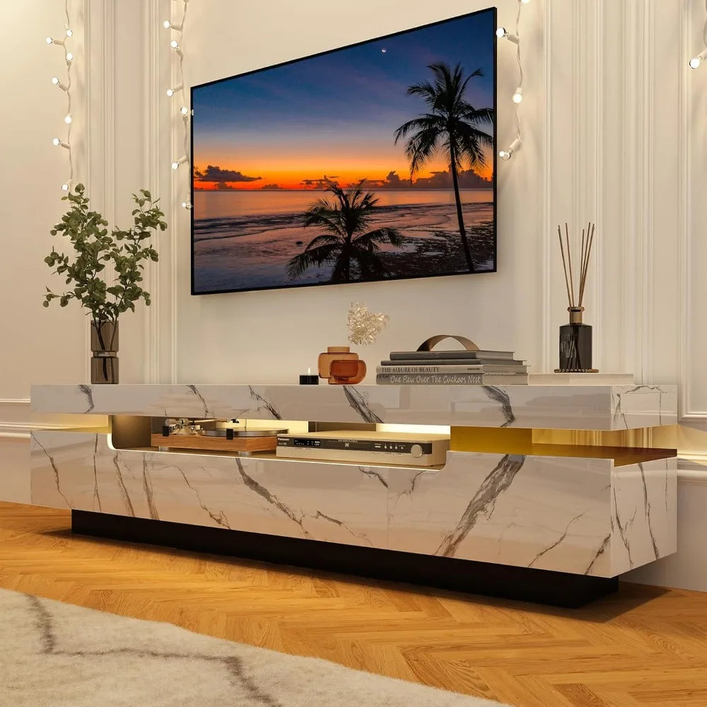 The ZHUXIANG Modern LED TV Stand offers a perfect blend of style, functionality, and entertainment. This 70-inch TV stand features customizable RGB lighting that can be controlled via a mobile app, allowing you to set the perfect ambiance for any occasion. With a matching 47.3-inch coffee table, this set elevates your living room with its sleek, high-gloss finish and modern marbling design. Whether you’re hosting a party or enjoying a movie night, the vibrant LED lights that dance to the sound will add excitement and flair to your space.