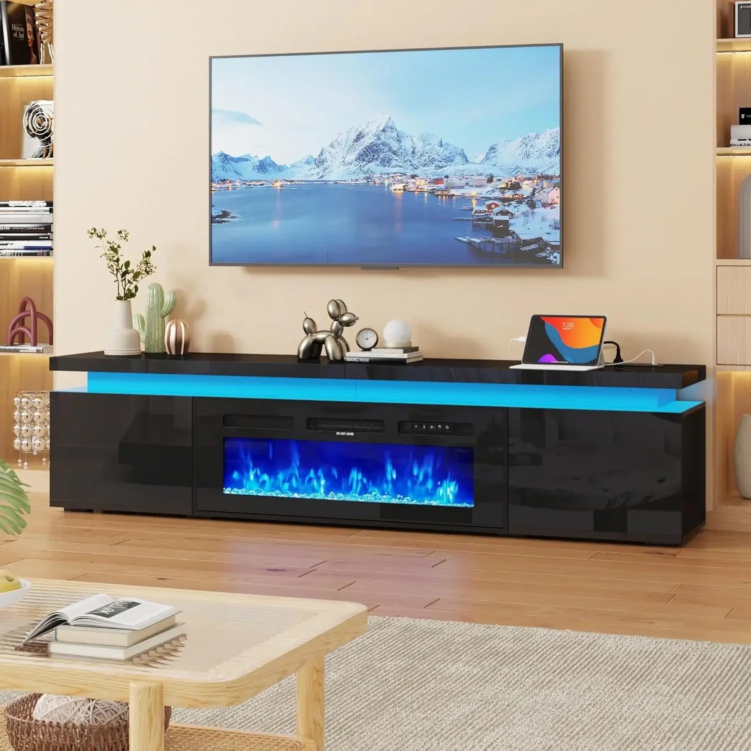 The 71" Crystal Electric Fireplace TV Stand combines sleek modern design with the warmth and ambiance of a built-in 40" electric fireplace. Perfect for TVs up to 80", this high-gloss black entertainment center features two spacious cabinets and LED lighting that changes to the beat of the music, creating an immersive experience for movie nights or gatherings. With convenient power outlets and USB ports, this multifunctional stand doubles as a media console and storage solution, while the crystal ember bed adds a visually striking touch to your living room.
