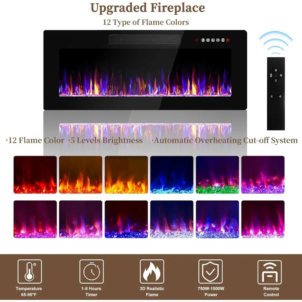 • 36" electric fireplace with 5 brightness and speed levels, 12 flame colors, and 20-color LED lights