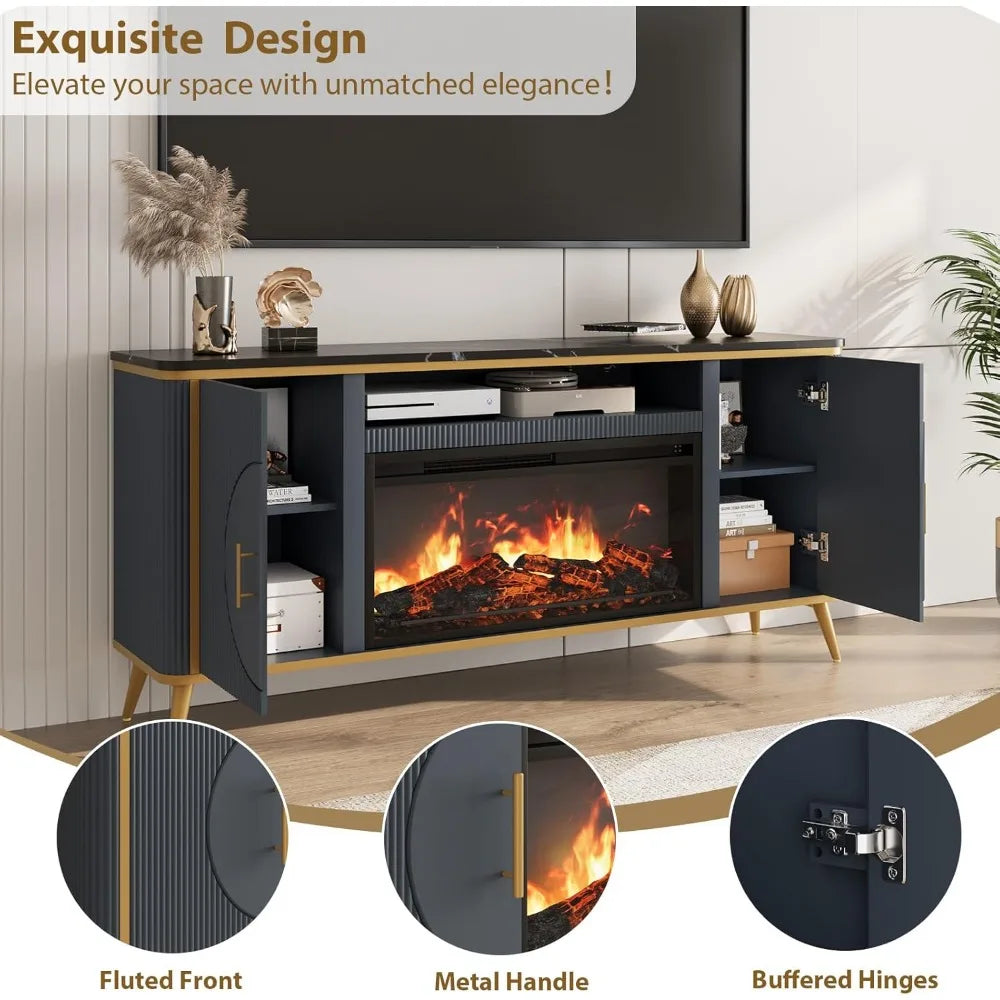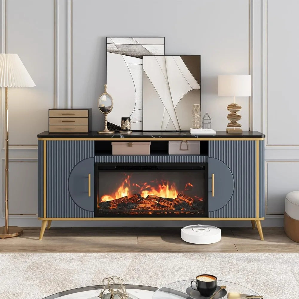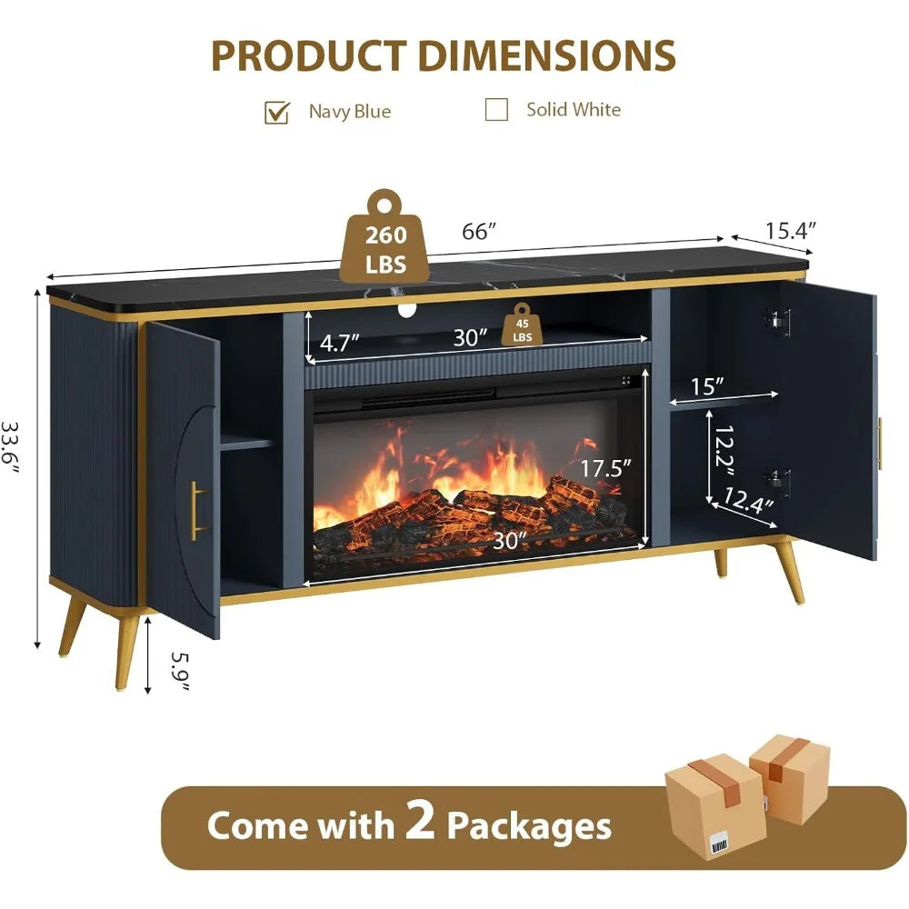 The Navy Blue Fluted Fireplace TV Stand combines luxurious design with functionality, providing a stylish media center with a built-in 30" electric fireplace. Designed to fit up to 80" TVs, this TV stand offers ample storage space and features a unique fluted design with a premium simulated marble surface. With adjustable shelves and a child-safe anti-tip mechanism, this stand adds warmth and sophistication to any living room.