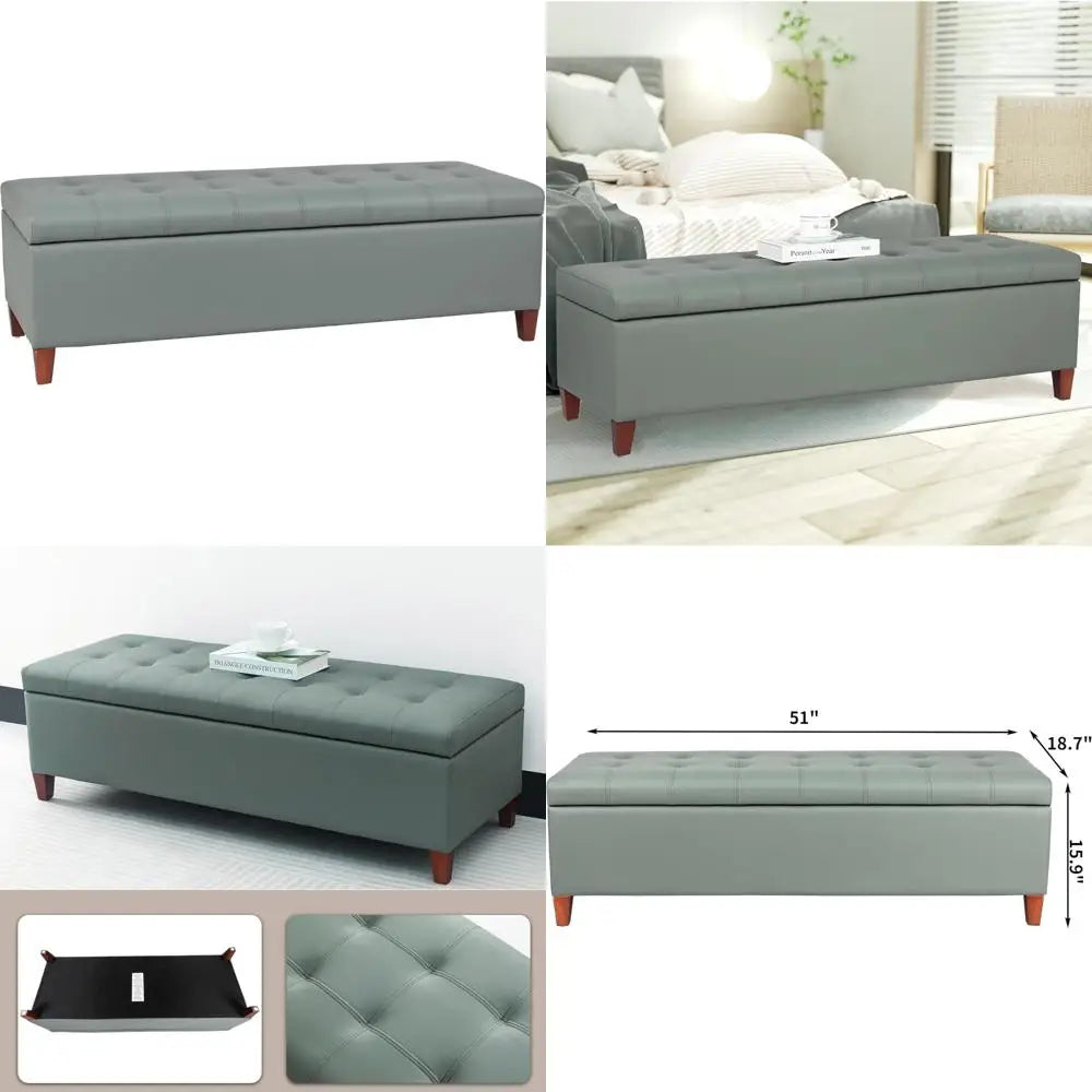 This stunning Gray Green 51" Tufted Leather Storage Ottoman Bench combines style, comfort, and functionality, making it an ideal addition to your bedroom or living room. Upholstered with high-quality faux leather and filled with high-density foam, it offers a plush seating experience while providing generous storage space for blankets, pillows, clothes, or books. The sturdy wood frame and child-safe hinges ensure durability and safety, making it a versatile piece for extra seating or as a decorative accent in your home.