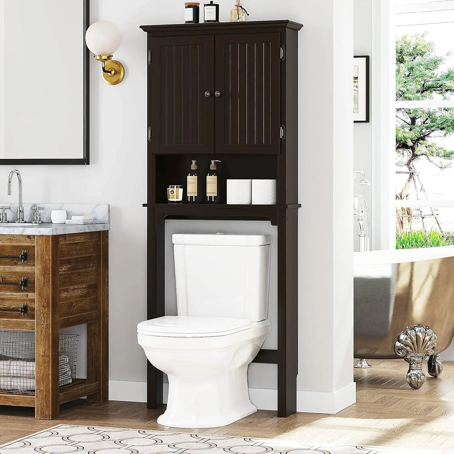 This modern style cabinet is an essential addition to any home requiring more storage. It does not come with a mirror light, making it suitable for rooms that already have ample lighting. The unit is constructed from high-quality MDF with zinc handles, ensuring durability and longevity. It features a rich espresso finish that complements a variety of decor styles. The cabinet offers adjustable and removable features, making it versatile for different storage needs. Measuring 7.8 inches deep, 27 inches wide, and 66 inches high, it provides ample space for storing towels among other items.